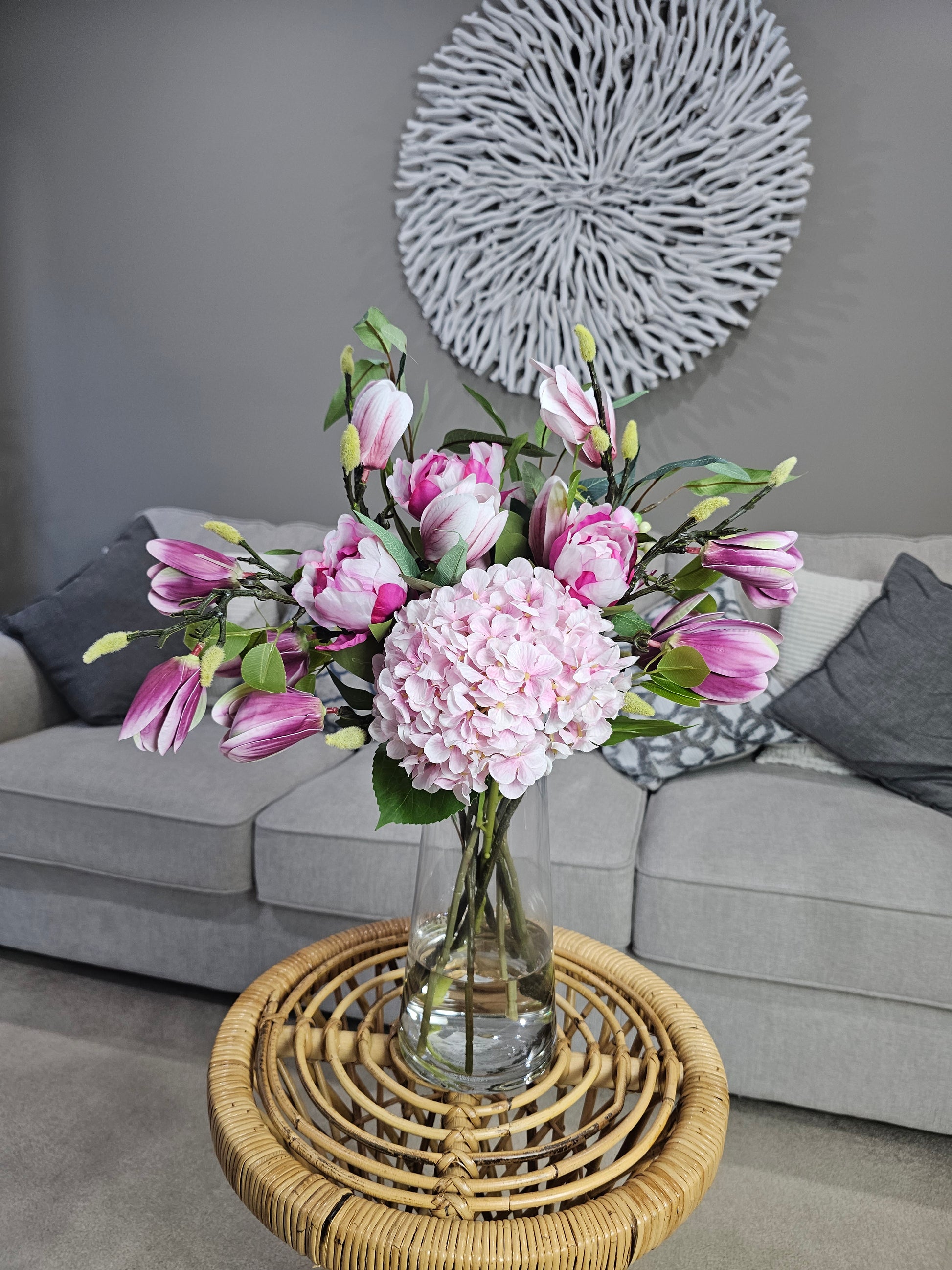 Soft, romantic, and endlessly elegant — Glasshouse Pink is a handcrafted arrangement featuring delicate pink hydrangeas, graceful magnolias, and full peonies, all nestled in a clear glass vase.
